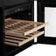 Встраиваемые холодильники для вина оснащаются специальной системой вентиляции: охлаждающая система у них находится в нижней части корпуса спереди. На такие устройства не навешивается мебельный фасад: дверца с затемненным стеклом остается на виду и открывается на достаточно широкий угол для свободного выдвижения деревянных полок.