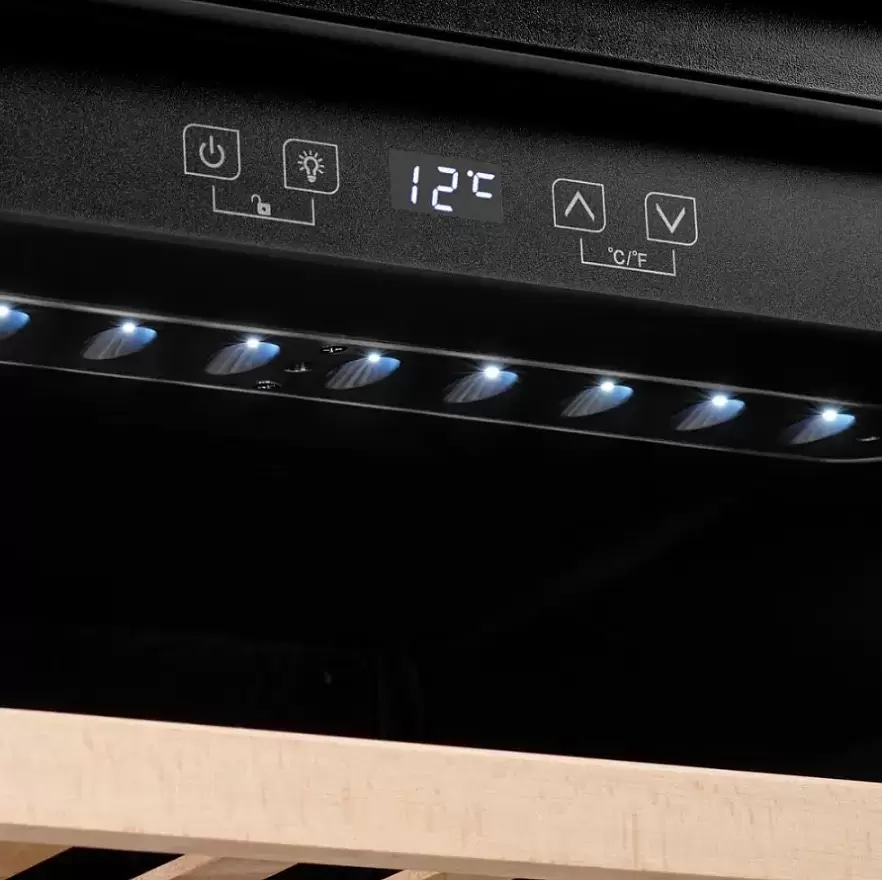 Большинство современных винных шкафов имеет электронное управление, они могут оснащаться обычными цифровыми дисплеями, на которых будет отображаться минимум информации — о включении, температуре в камере и возникших неисправностях. Однако в большинстве моделей используются текстовые сенсорные дисплеи из нескольких сегментов. С помощью кнопок сенсорного меню на этих дисплеях можно отображать и регулировать температуру в каждой зоне отдельно с точностью до градуса, выбирать уровень влажности, задавать дополнительные опции — отключение сигнализации, включение вентиляции и внутреннего освещения, активацию защиты от детей, тип отображения температуры ºF/ºC. Здесь же будут появляться коды ошибок, выданные системой обнаружения неисправностей.