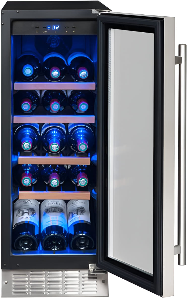 Дверца у большинства винных шкафов изготавливается из многослойного тонированного стекла. Такой материал, с одной стороны, позволяет оценивать коллекцию вин визуально, не открывая дверцу, в условиях стабильной температуры и влажности. С другой стороны, затемненное стекло с УФ-фильтром в виде напыления или специальной пленки надежно изолирует винные бутылки негативного воздействия ультрафиолетового излучения. Несколько слоев стекла обеспечивают при этом дополнительную защиту. Очень часто стекло в дверце заключается в рамку из дерева или металла. Натуральный или окрашенный металл или дерево не только способствуют прочности конструкции, но и превращают винный холодильник, особенно отдельно стоящий, в эффектный элемент обстановки.