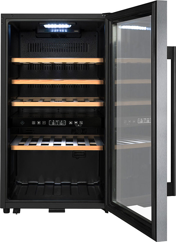 Большинство современных винных шкафов имеет электронное управление, они могут оснащаться обычными цифровыми дисплеями, на которых будет отображаться минимум информации — о включении, температуре в камере и возникших неисправностях. Однако в большинстве моделей используются текстовые сенсорные дисплеи из нескольких сегментов. С помощью кнопок сенсорного меню на этих дисплеях можно отображать и регулировать температуру в каждой зоне отдельно с точностью до градуса, выбирать уровень влажности, задавать дополнительные опции — отключение сигнализации, включение вентиляции и внутреннего освещения, активацию защиты от детей, тип отображения температуры ºF/ºC. Здесь же будут появляться коды ошибок, выданные системой обнаружения неисправностей.