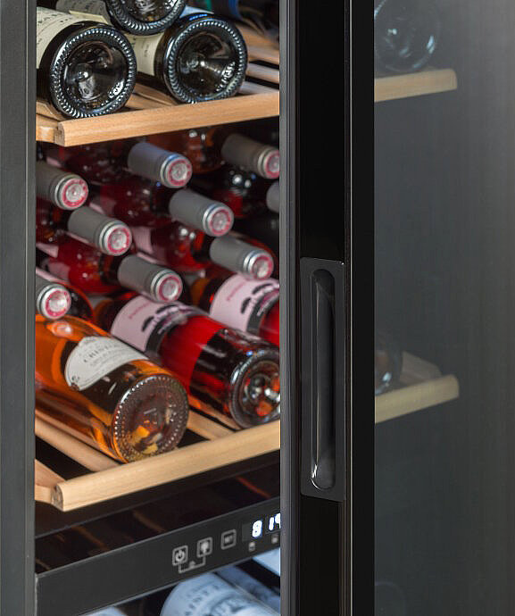 Стеклянная дверца винного шкафа — опция, которая решает сразу несколько задач. Прежде всего, она обеспечивает хороший обзор, позволяет контролировать коллекцию и демонстрировать ее, не открывая дверцу и не нарушая температурный режим. Стекло не только позволяет изолировать вино от наружного воздуха, но и не пропускает посторонние запахи. Прямые солнечные лучи также отрицательно влияют на качество вина, вызывая окисление танина — соединения, которое в нем содержится, и напиток становится горьким. Стеклянные дверцы снабжаются фильтрами или покрытием, защищающим бутылки по ультрафиолета. Способы защиты могут быть самыми разными — от наклеенной пленки до специального напыления. Иногда в дверцу устанавливается зеркальное стекло, в других случаях на него наносят тонировку в технике шелкографии.