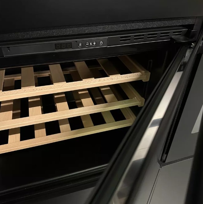 Встраиваемые холодильники для вина оснащаются специальной системой вентиляции: охлаждающая система у них находится в нижней части корпуса спереди. На такие устройства не навешивается мебельный фасад: дверца с затемненным стеклом остается на виду и открывается на достаточно широкий угол для свободного выдвижения деревянных полок.