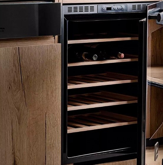 Встраиваемые холодильники для вина оснащаются специальной системой вентиляции: охлаждающая система у них находится в нижней части корпуса спереди. На такие устройства не навешивается мебельный фасад: дверца с затемненным стеклом остается на виду и открывается на достаточно широкий угол для свободного выдвижения деревянных полок.