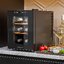 Электронное управление помогает быстро разобраться в том, как функционирует эта модель, и легко настроить все необходимые параметры. На дисплее отображаются данные, которые собирают датчики в камере. Лампочки, расположенные внутри, хорошо подсвечивают бутылки. Всего полок, на которых можно разместить коллекцию, в шкафу 2 шт.