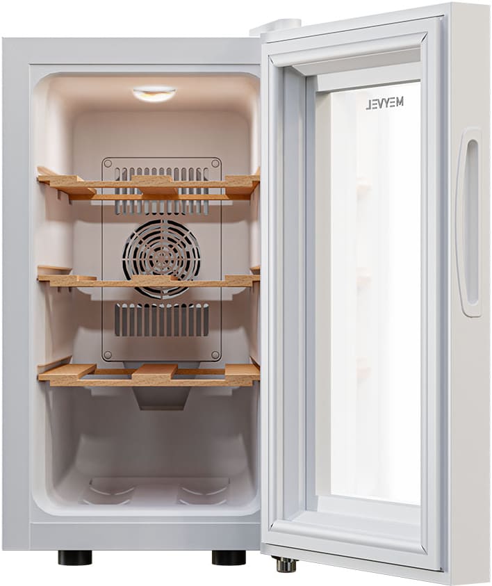 Одна камера в технике такого типа встречается чаще всего, потому что в ней просто расположить все функциональные детали, и в итоге прибор действительно похож на обычный шкаф. Охлажденный воздух поступает внутрь благодаря термоэлектрическому элементу. Размораживать — удалять иней со стенок и поддерживать тем самым оптимальные условия — необходимо вручную. Общий диапазон температур, которые можно установить: 8-18 градусов. Средняя влажность воздуха (в процентах), которая поддерживается, чтобы пробки в бутылках не пересыхали: 60-80.