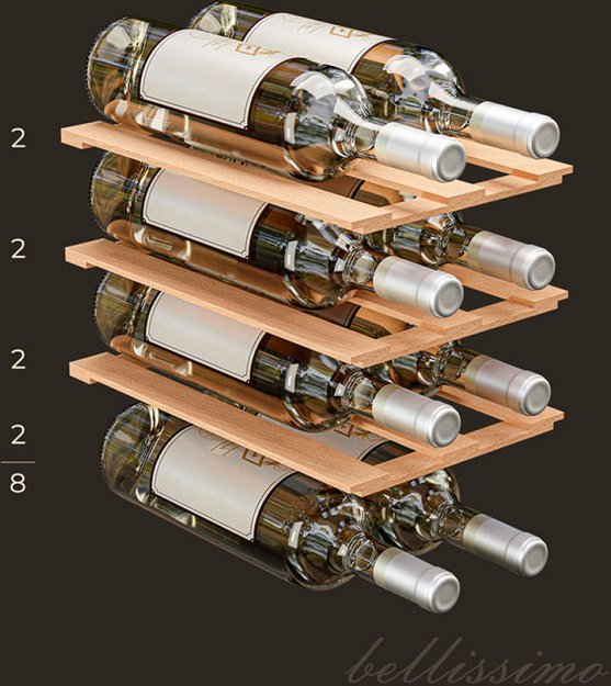 Полки в винных шкафах позволяют размещать бутылки для хранения в горизонтальном положении. Это необходимо, чтобы пробка постоянно смачивалась жидкостью и не пересыхала. Плотно закрытая пробка гарантирует, что внутрь бутылки не проникнет наружный воздух. Кислород, содержащийся в воздухе, может стать причиной ухудшения вкуса вина и даже его скисания. Кроме того, горизонтальное положение позволяет лучше оценить количество осадка. Материал изготовления полок выбирается, исходя из требований, предъявляемых к содержанию коллекции вин. Одним из основных требования является отсутствие или максимальное сокращение вибрации и хорошая фиксация бутылок на месте хранения. Даже если полка выдвигается, бутылки должны оставаться на своем месте. Второе требование исключает применение стеклянных полок, как в обычном холодильнике: на них почти невозможно зафиксировать бутылки.