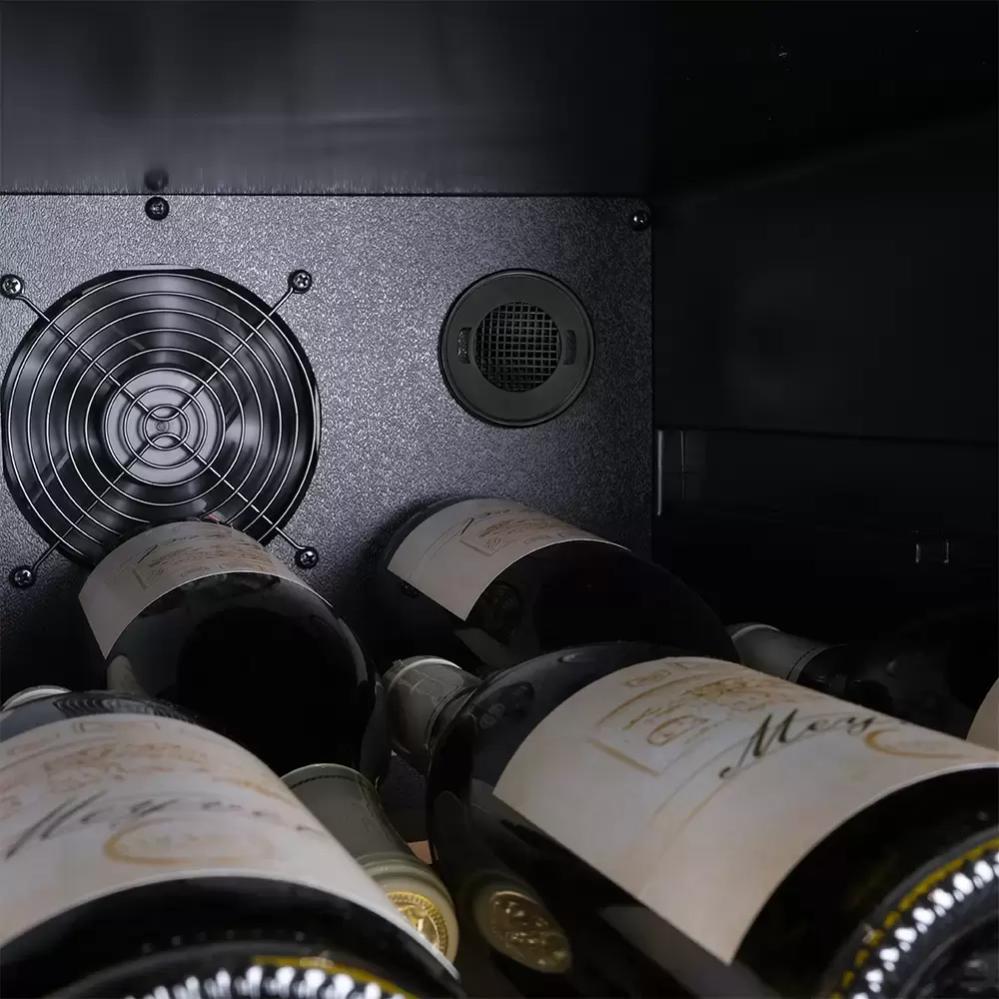 Стеклянная дверь — дополнительный изящный штрих к общему дизайну модели. Специальное покрытие защищает вино от влияния ультрафиолетовых лучей, которые проникают, если шкаф находится в солнечной комнате. Хранение становится еще безопаснее и герметичнее благодаря нескольким слоям стекол. Цвет корпуса — черный.