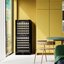 Встраиваемые холодильники для вина оснащаются специальной системой вентиляции: охлаждающая система у них находится в нижней части корпуса спереди. На такие устройства не навешивается мебельный фасад: дверца с затемненным стеклом остается на виду и открывается на достаточно широкий угол для свободного выдвижения деревянных полок.