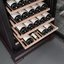 Стеклянная дверь — дополнительный изящный штрих к общему дизайну модели. Специальное покрытие защищает вино от влияния ультрафиолетовых лучей, которые проникают, если шкаф находится в солнечной комнате. Хранение становится еще безопаснее и герметичнее благодаря нескольким слоям стекол. Цвет корпуса — темный шоколад.
