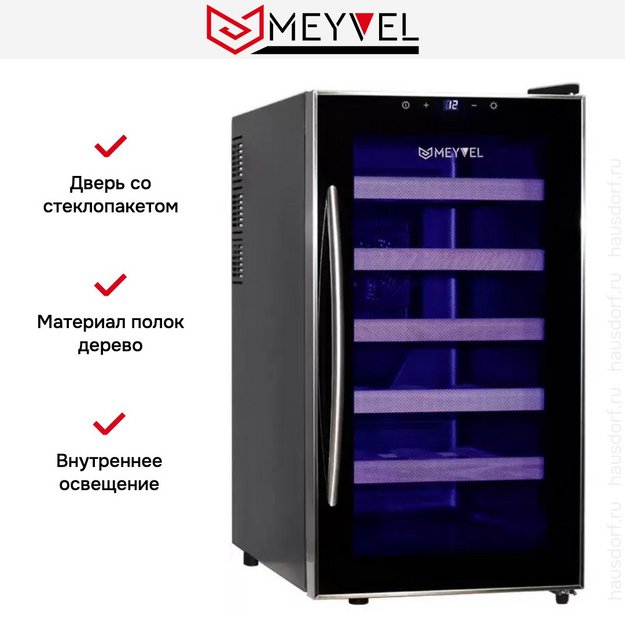 Для длительного сохранения установленных параметров в винных шкафах Meyvel используется дверца с многослойным остеклением. Такое решение позволяет удерживать холод внутри камеры вне зависимости от температуры в помещении, а также сохранить температуру при отключении электроэнергии.