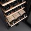 Стеклянная дверь — дополнительный изящный штрих к общему дизайну модели. Специальное покрытие защищает вино от влияния ультрафиолетовых лучей, которые проникают, если шкаф находится в солнечной комнате. Хранение становится еще безопаснее и герметичнее благодаря нескольким слоям стекол. Цвет корпуса — черный.