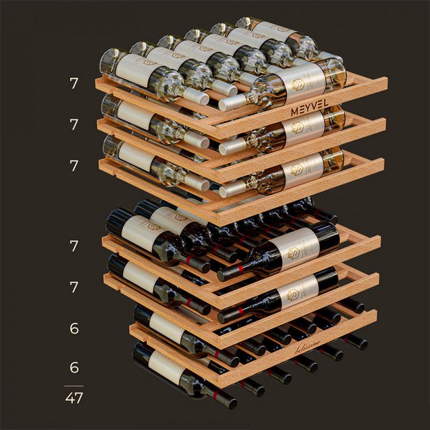 Винный холодильник Meyvel MV47PRO-KBB2 имеет две температурные зоны, в которых одновременно можно хранить разные сорта алкоголя и выставлять разные сочетания настроек. Он встраивается в нишу, что удобно, если у вас ограничен метраж помещения. Благодаря компактным размерам данная модель — отличный выбор для офиса, гостиничного номера. Количество бутылок, которое можно разместить с учетом полной комплектации и из расчета объема бутылки 0,75 л, — 47 шт.