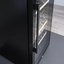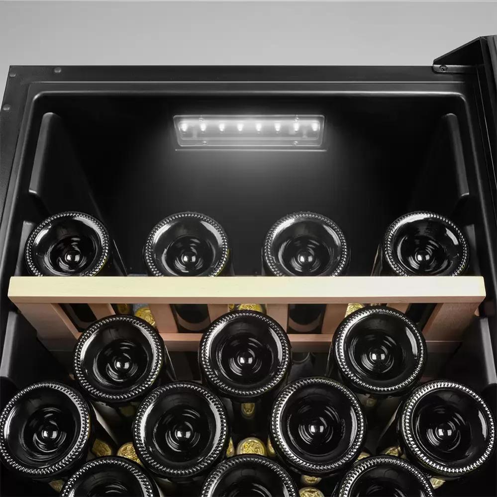 Стеклянная дверь — дополнительный изящный штрих к общему дизайну модели. Специальное покрытие защищает вино от влияния ультрафиолетовых лучей, которые проникают, если шкаф находится в солнечной комнате. Хранение становится еще безопаснее и герметичнее благодаря нескольким слоям стекол. Цвет корпуса — черный.