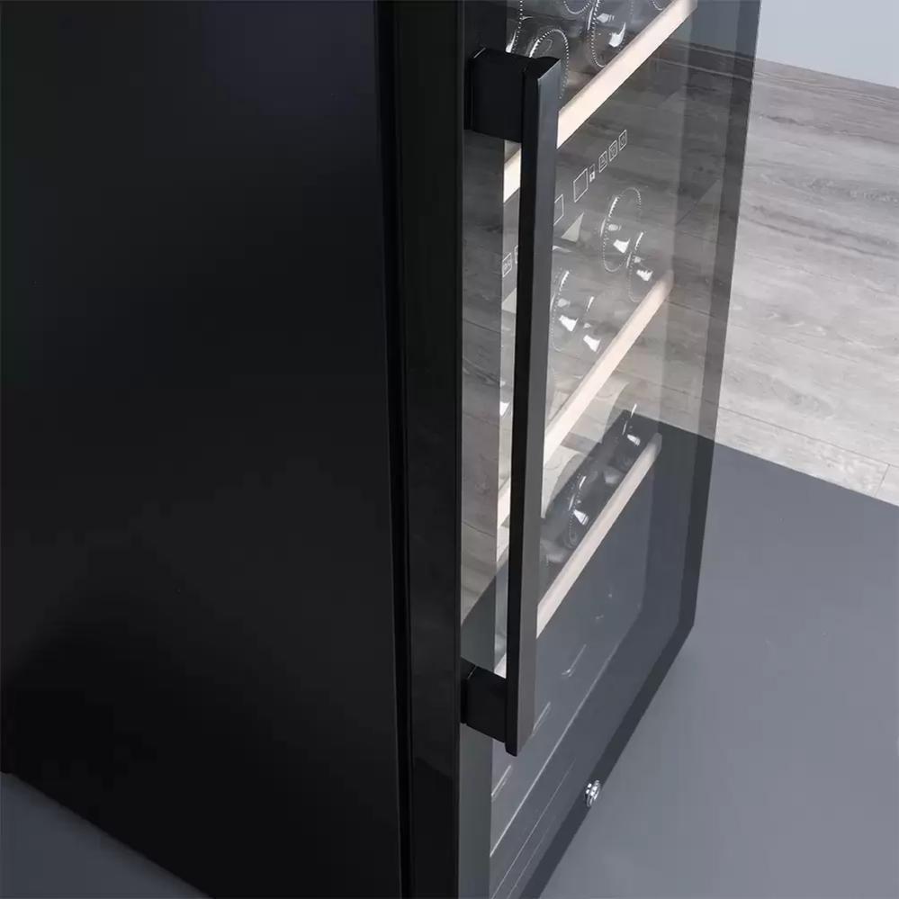 Вид и расположение ручки на дверце винного шкафа зависит прежде всего от дизайна и стиля изделия. В классических холодильниках со корпусом из дерева чаще всего используется внешняя ручка «под старину», изготовленная из металла — например, латуни, под бронзу или медь. Модели в современном стиле оснащаются внешними ручками из металла, выполненными в минималистическом стиле, или скрытыми ручками, создающими снаружи гладкую поверхность, за которой легко ухаживать. Некоторые производители предлагают винные шкафы без ручек: дверца у них открывается нажатием на среднюю или верхнюю часть.