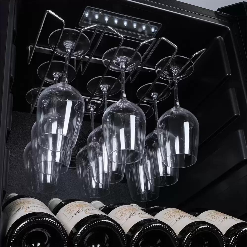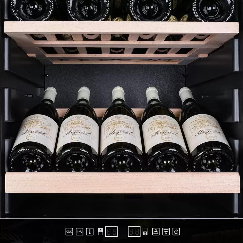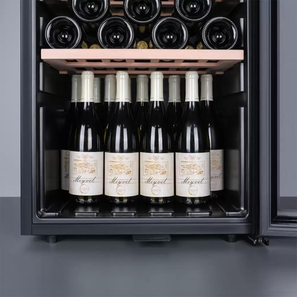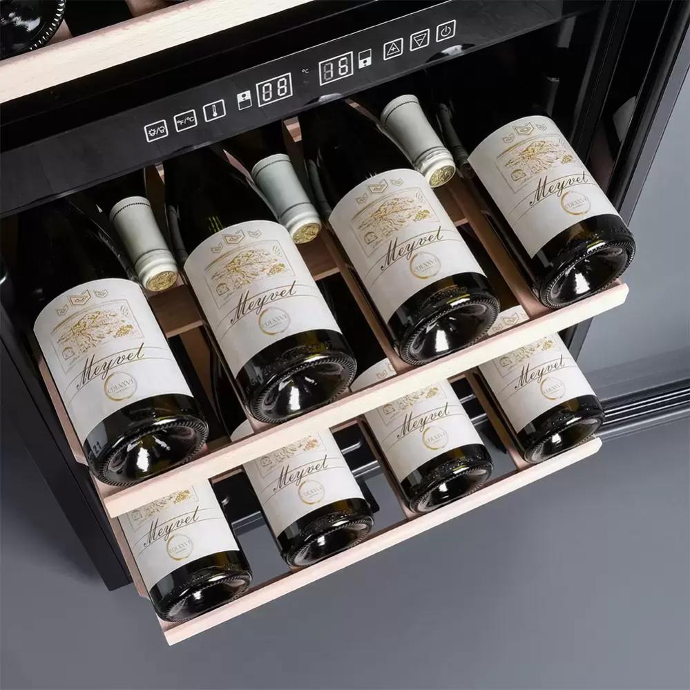 Винный холодильник Meyvel MV98-KBF2 имеет две температурные зоны, в которых одновременно можно хранить разные сорта алкоголя и выставлять разные сочетания настроек. Он устанавливается отдельно, что удобно, если у вас есть специальное помещение — кладовая, погреб и т.д. Количество бутылок, которое можно разместить с учетом полной комплектации и из расчета объема бутылки 0,75 л, — 98 шт.