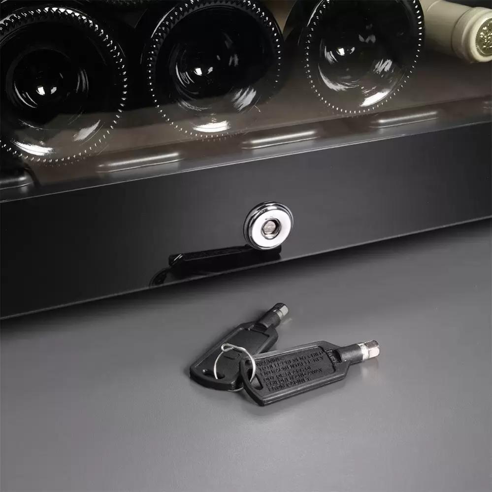 Замок в винных шкафах предназначается для предотвращения нежелательного доступа — в частности, для защиты винной коллекции от детей. Механический замок может располагаться на дверце, как у обычного шкафа или сейфа. Если же дверца холодильника полностью изготовлена из стекла, замок может находиться на цокольной решетке. Такие замки комплектуются набором ключей. Иногда на дверце устанавливаются электронные замки, открыть которые можно при помощи комбинации кнопок или при помощи чипа. Выбрать шкаф с замком можно как для установки в баре или кафе, так и для домашнего использования.