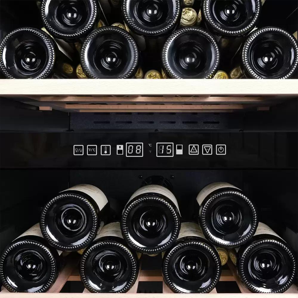 Большинство современных винных шкафов имеет электронное управление, они могут оснащаться обычными цифровыми дисплеями, на которых будет отображаться минимум информации — о включении, температуре в камере и возникших неисправностях. Однако в большинстве моделей используются текстовые сенсорные дисплеи из нескольких сегментов. С помощью кнопок сенсорного меню на этих дисплеях можно отображать и регулировать температуру в каждой зоне отдельно с точностью до градуса, выбирать уровень влажности, задавать дополнительные опции — отключение сигнализации, включение вентиляции и внутреннего освещения, активацию защиты от детей, тип отображения температуры ºF/ºC. Здесь же будут появляться коды ошибок, выданные системой обнаружения неисправностей.