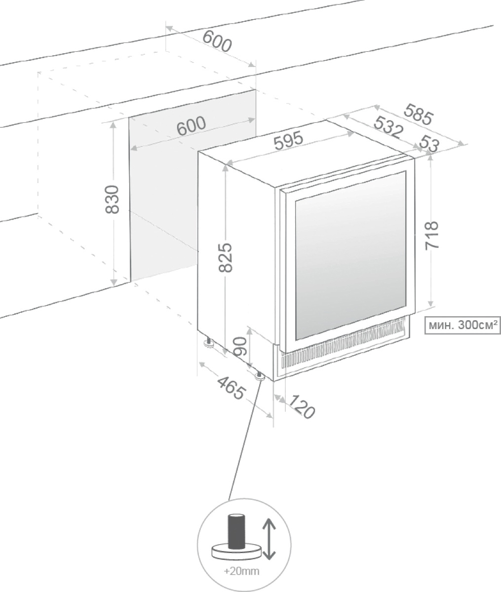 Некоторые отдельно стоящие винные шкафы, а также модели, встраиваемые в мебельную колонну, шкаф или другое закрытое пространство, оснащаются системой забора воздуха и вентиляционной решеткой, расположенными спереди в нижней части корпуса. Зазоры между корпусом шкафа и стенками мебели необходимы и в этом случае.