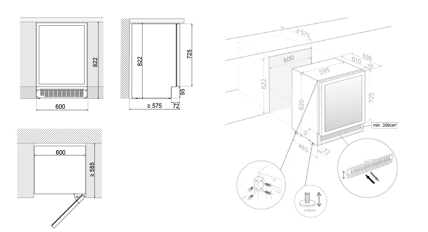 Некоторые отдельно стоящие винные шкафы, а также модели, встраиваемые в мебельную колонну, шкаф или другое закрытое пространство, оснащаются системой забора воздуха и вентиляционной решеткой, расположенными спереди в нижней части корпуса. Зазоры между корпусом шкафа и стенками мебели необходимы и в этом случае.