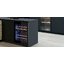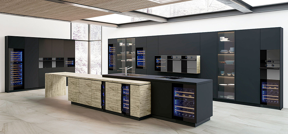 Встраиваемые холодильники для вина оснащаются специальной системой вентиляции: охлаждающая система у них находится в нижней части корпуса спереди. На такие устройства не навешивается мебельный фасад: дверца с затемненным стеклом остается на виду и открывается на достаточно широкий угол для свободного выдвижения деревянных полок.