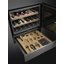 Встраиваемые холодильники для вина оснащаются специальной системой вентиляции: охлаждающая система у них находится в нижней части корпуса спереди. На такие устройства не навешивается мебельный фасад: дверца с затемненным стеклом остается на виду и открывается на достаточно широкий угол для свободного выдвижения деревянных полок.