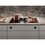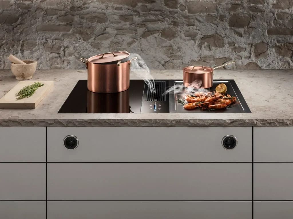Вытяжки, встраиваемые в столешницу — эффективная инновация, которая подойдет для установки в кухне любой площади. Такие вытяжки размещаются за варочной поверхностью или рядом с ней. В отключенном состоянии всасывающая панель находится под столешницей, но после включения одной или нескольких конфорок она автоматически выдвигается при помощи специального лифтового механизма. Загрязненный воздух улавливается, не успевая распространиться по помещению. Когда вытяжка убрана, на виду остается только сенсорная панель управления. Недостатком подобных моделей является только сравнительно высокая цена.