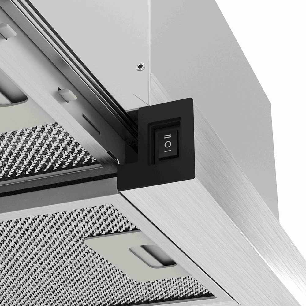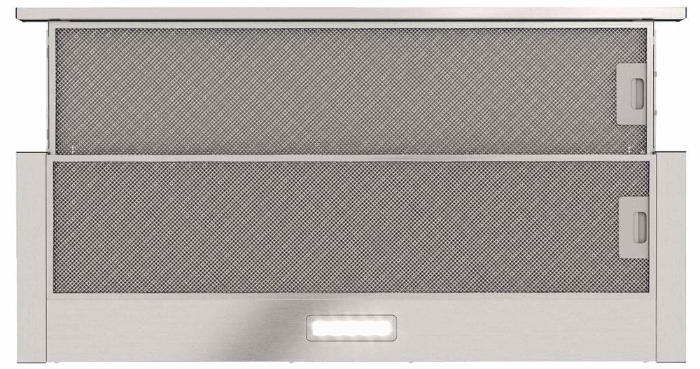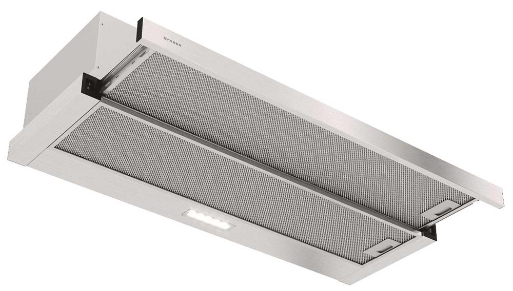 Можно выделить два основных вида вытяжек с выдвижной панелью. В вытяжках, встраиваемых в подвесной шкаф, выдвижная панель необходима, так как размеры таких устройств определяются размерами самого шкафа. В закрытом состоянии глубина вытяжки может быть меньше глубины варочной поверхности. Телескопическая выдвижная панель, которая устанавливается преимущественно в устройствах, работающих в режиме отвода, гарантирует полный захват воздуха, загрязненного каплями жира, частицами сажи, испарениями. Панель можно выдвинуть как нажатием на кнопку, так и потянув за ее переднюю часть. В некоторых моделях при подобном выдвижении одновременно включается подсветка. Когда же панель убрана, вытяжка становится практически незаметной — такой вариант лучше всего подходит для небольшой кухни.