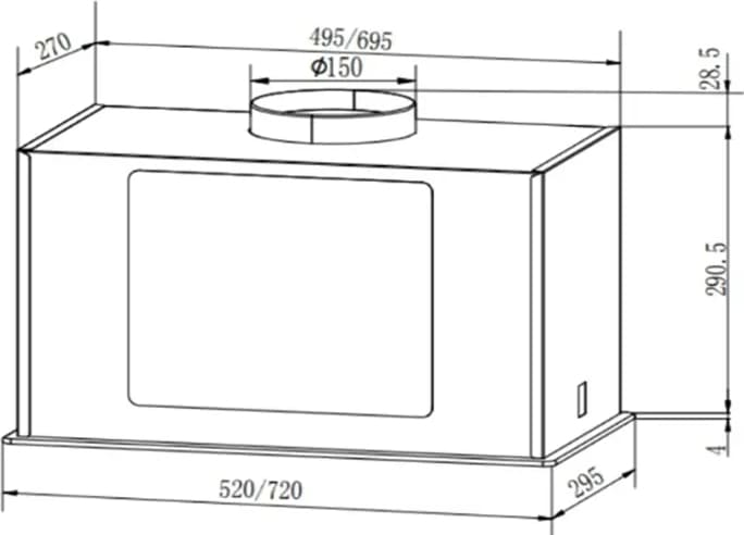 Устройство подключается к вентиляционной системе через воздуховод диаметром 150 мм, что обеспечивает надёжный отвод пара, жировых испарений, дыма и насыщенных кулинарных ароматов непосредственно из зоны приготовления. Такой подход не только поддерживает свежесть воздуха, но и защищает стены, мебель и технику от постепенного накопления загрязнений, продлевая срок их службы. Несмотря на компактные размеры, вытяжка демонстрирует высокую производительность и работает с минимальным уровнем шума, что делает её идеальной как для небольших квартир-студий, так и для уютных кухонь в частных домах.
