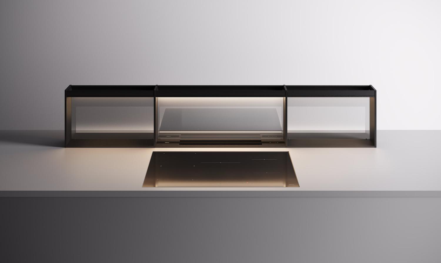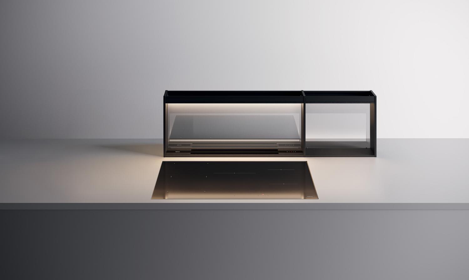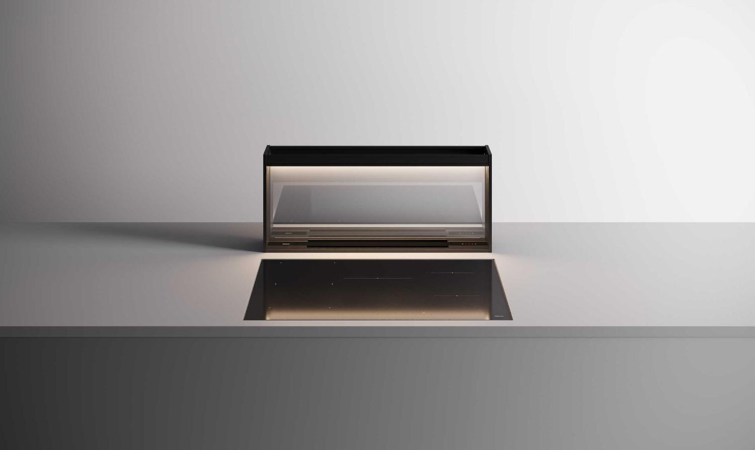 Вытяжки, встраиваемые в столешницу — эффективная инновация, которая подойдет для установки в кухне любой площади. Такие вытяжки размещаются за варочной поверхностью или рядом с ней. В отключенном состоянии всасывающая панель находится под столешницей, но после включения одной или нескольких конфорок она автоматически выдвигается при помощи специального лифтового механизма. Загрязненный воздух улавливается, не успевая распространиться по помещению. Когда вытяжка убрана, на виду остается только сенсорная панель управления. Недостатком подобных моделей является только сравнительно высокая цена.