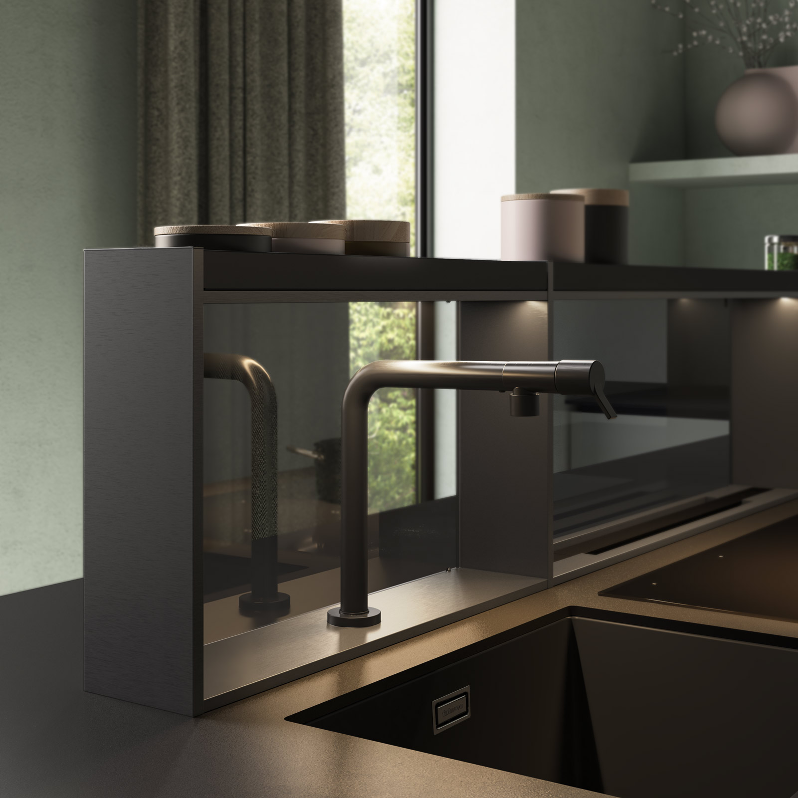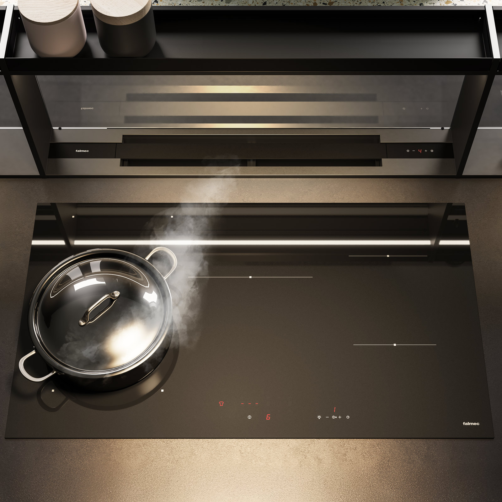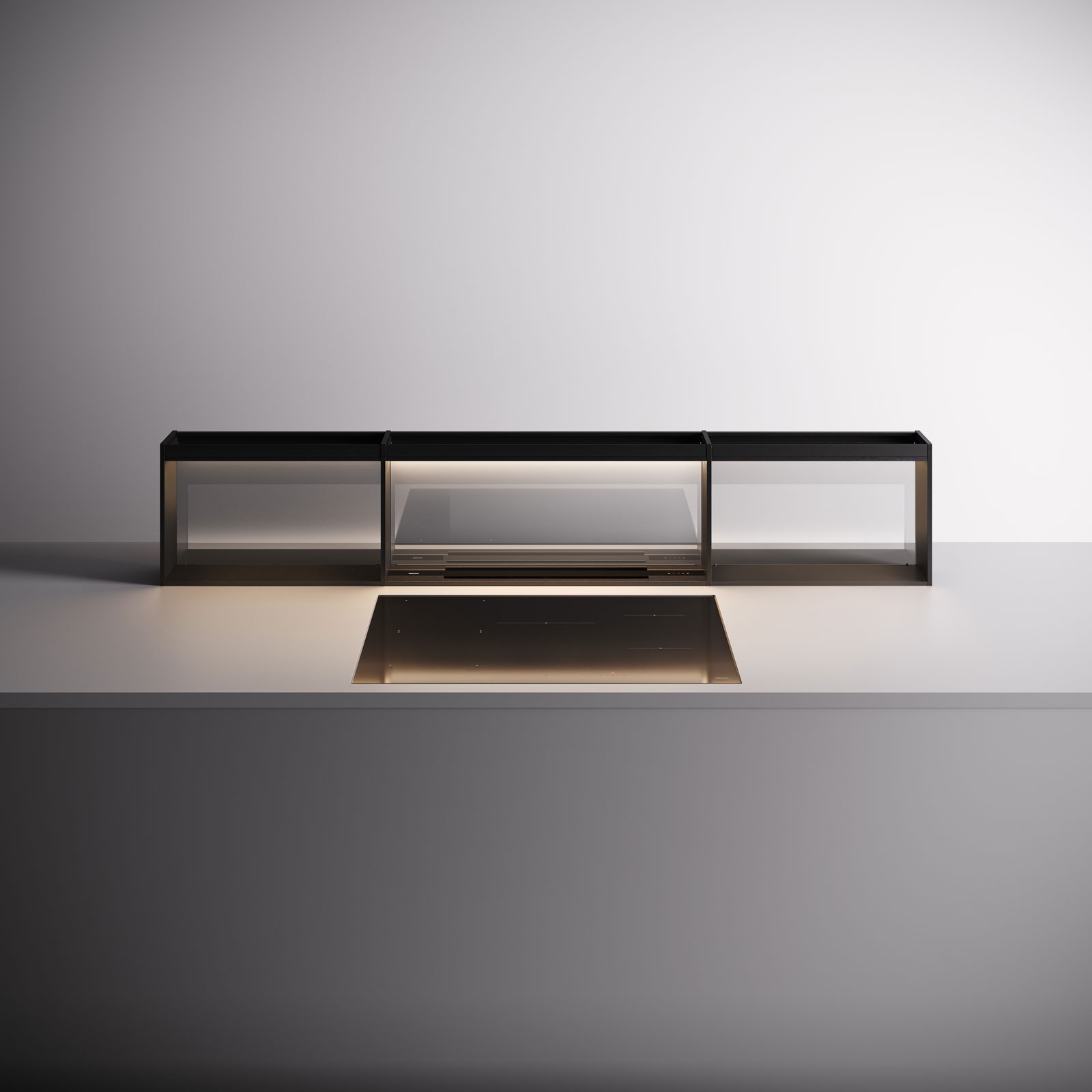 Вытяжки, встраиваемые в столешницу — эффективная инновация, которая подойдет для установки в кухне любой площади. Такие вытяжки размещаются за варочной поверхностью или рядом с ней. В отключенном состоянии всасывающая панель находится под столешницей, но после включения одной или нескольких конфорок она автоматически выдвигается при помощи специального лифтового механизма. Загрязненный воздух улавливается, не успевая распространиться по помещению. Когда вытяжка убрана, на виду остается только сенсорная панель управления. Недостатком подобных моделей является только сравнительно высокая цена.