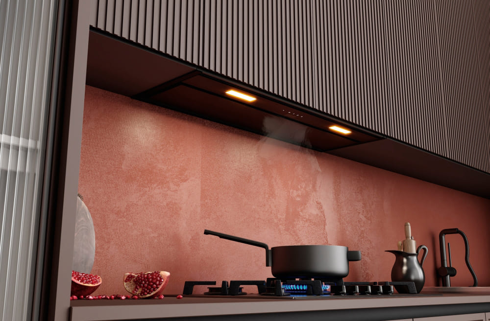 Вытяжки, встраиваемые в столешницу — эффективная инновация, которая подойдет для установки в кухне любой площади. Такие вытяжки размещаются за варочной поверхностью или рядом с ней. В отключенном состоянии всасывающая панель находится под столешницей, но после включения одной или нескольких конфорок она автоматически выдвигается при помощи специального лифтового механизма. Загрязненный воздух улавливается, не успевая распространиться по помещению. Когда вытяжка убрана, на виду остается только сенсорная панель управления. Недостатком подобных моделей является только сравнительно высокая цена.