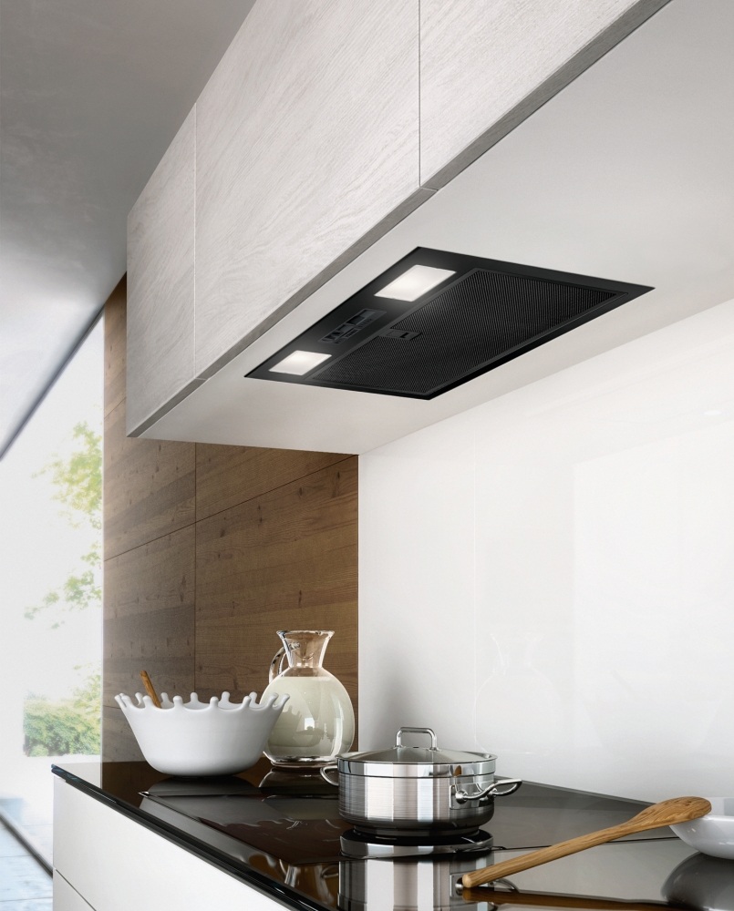 Вытяжка устанавливается в шкаф или в потолочную нишу — таким образом все соединительные элементы и корпус оказываются скрыты. Это подходящий вариант для небольшого помещения, если нужно максимально освободить пространство, а также необходимость, если вы продумываете кухонный дизайн до мелочей.