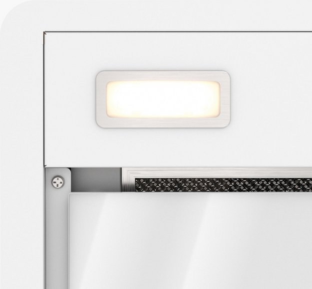 Воздух всасывается по периметру вытяжки через узкие щели. Он собирается в потоки, которые направляются прямо к фильтрам внутри, не рассеивается на кухне. Благодаря этой технологией вытяжку можно сделать компактнее и энергоэффективнее.