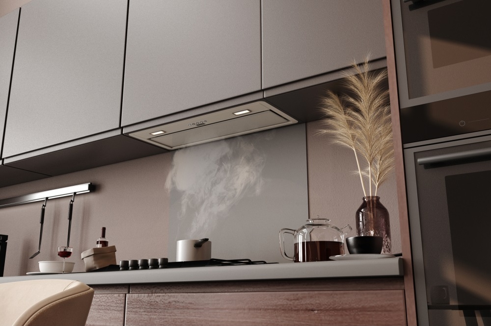 Встраивание вытяжки в шкаф — оптимальный вариант для малогабаритной кухни. Такие модели просты в установке, недороги, практически скрыты от глаз, их не нужно подбирать по внешнему виду, а также чем-то маскировать воздуховод. Уровень шума также снижается благодаря дополнительной звукоизоляции. Встроенные в шкаф модели могут дополняться выдвижной панелью, которая увеличивает площадь забора загрязненного воздуха. Иногда к встраиваемым относят также вытяжки, которые монтируются под подвесной шкаф, хотя их корпус остается на виду.