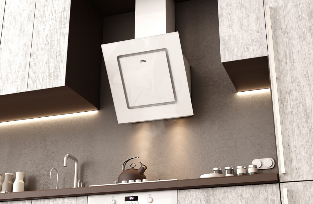 Наклонные модели — еще один вариант для небольшой кухни. Они размещаются на стене, но при высокой производительности не требуют много места. Их особенностью считается пониженный уровень шума и управление при помощи пульта ДУ. Эта категория вытяжек отличается большим разнообразием размеров, дизайна, цветов.