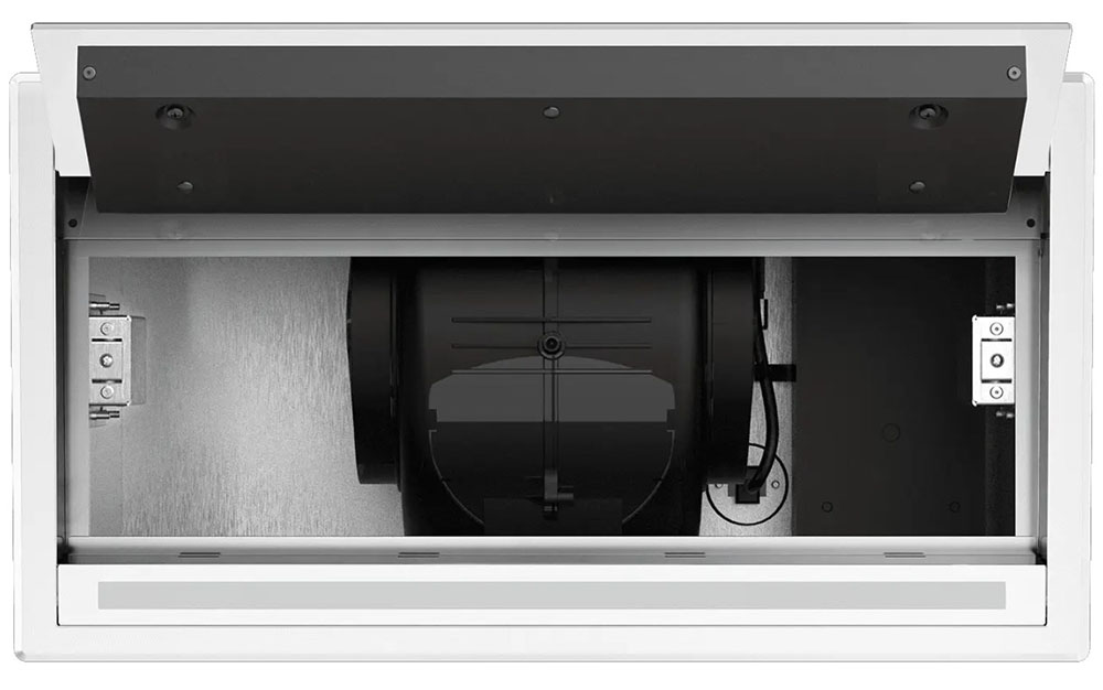 Вытяжки, встраиваемые в столешницу — эффективная инновация, которая подойдет для установки в кухне любой площади. Такие вытяжки размещаются за варочной поверхностью или рядом с ней. В отключенном состоянии всасывающая панель находится под столешницей, но после включения одной или нескольких конфорок она автоматически выдвигается при помощи специального лифтового механизма. Загрязненный воздух улавливается, не успевая распространиться по помещению. Когда вытяжка убрана, на виду остается только сенсорная панель управления. Недостатком подобных моделей является только сравнительно высокая цена.