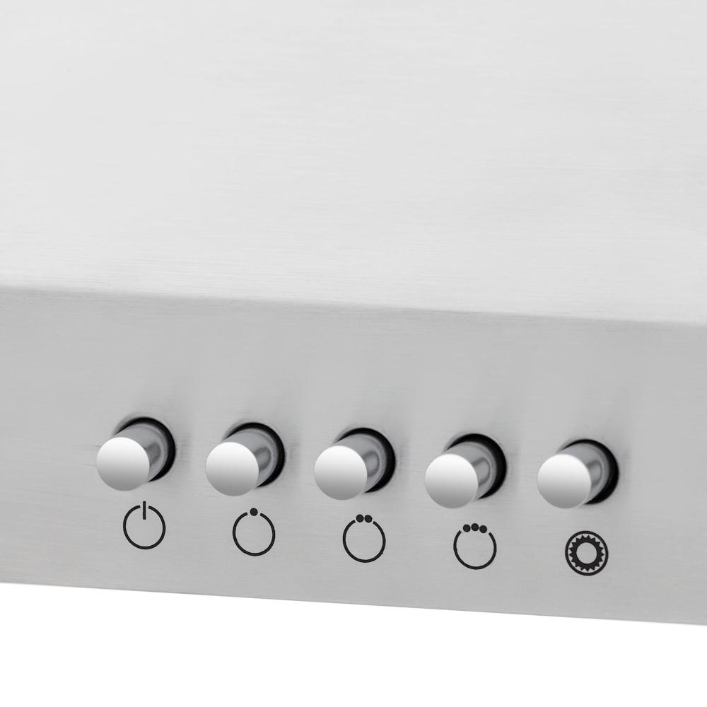 Наиболее распространенным элементом управления являются кнопки — ими оснащаются устройства с механическим управлением. Кнопки можно увидеть у вытяжек всех типов, от простых встраиваемых до дизайнерских подвесных, островных или наклонных. Количество кнопок зависит от набора функций: в простейшем случае достаточно всего трех кнопок — двух для переключения скоростей и одной для включения освещения. Как правило, они имеют круглую форму, однако производители предлагают устройства с квадратными и даже треугольными кнопками. В больших купольных вытяжках кнопки могут изготавливаться из меди, бронзы или латуни, а моделях современного дизайна — оснащаться подсветкой.