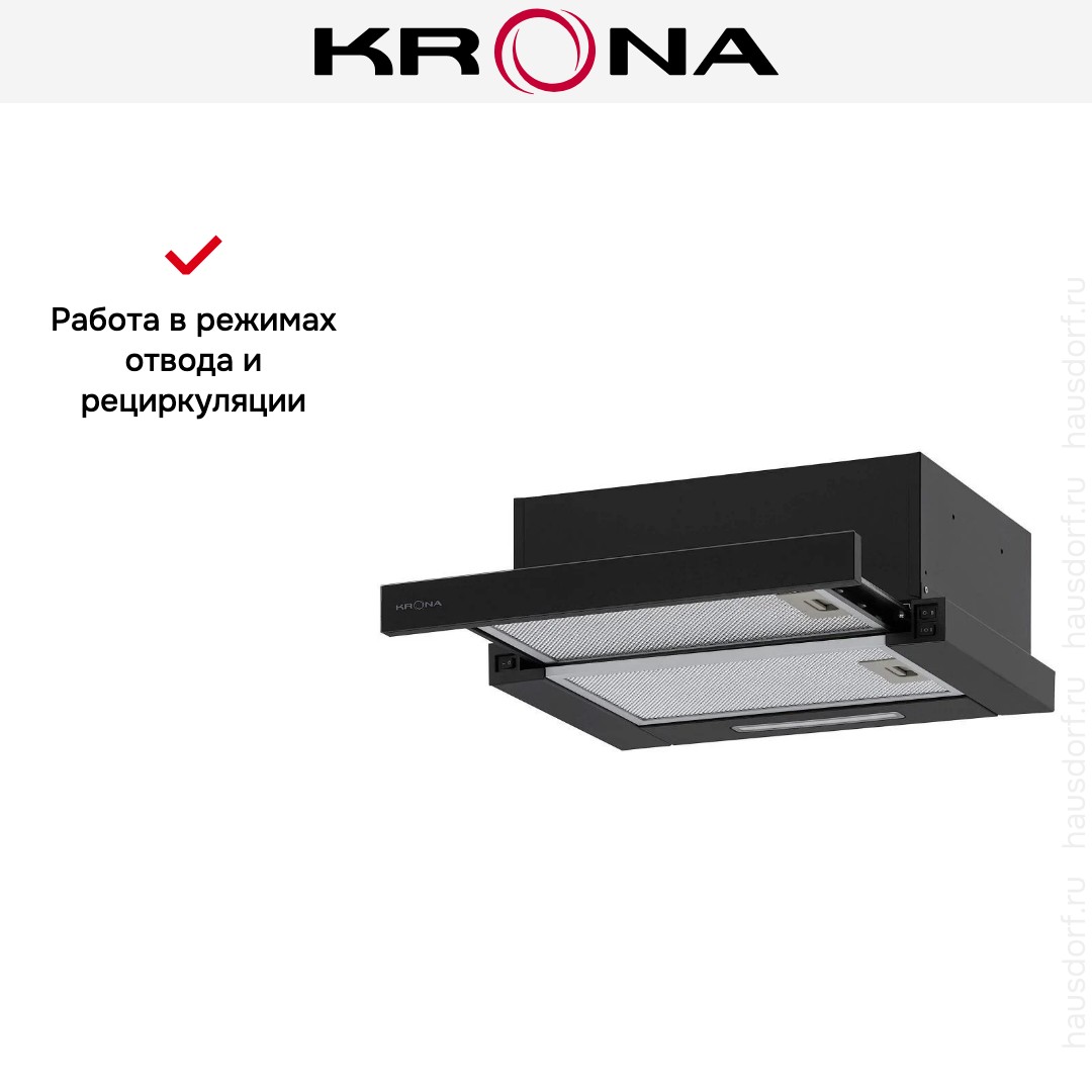 Встраиваемая вытяжка — выбор тех, кто хочет максимально задекорировать технику, или владельцев маленькой кухни. Тип встраивания: в шкаф. Обратите внимание на цветовые сочетания модели KRONA KAMILLA F 450 black, чтобы органично вписать ее в свою квартиру. Оттенок корпуса: черный. Благодаря лампочкам, которые расположены на нем, можно освещать плиту и столешницу рядом, чтобы готовить было еще проще и приятнее. Фишка этой техники — выдвижная панель.