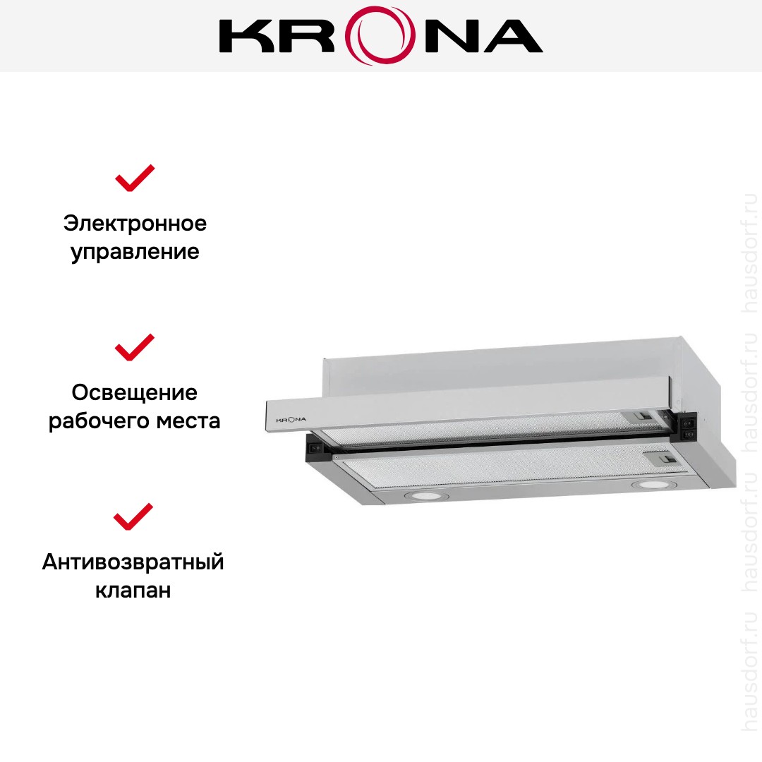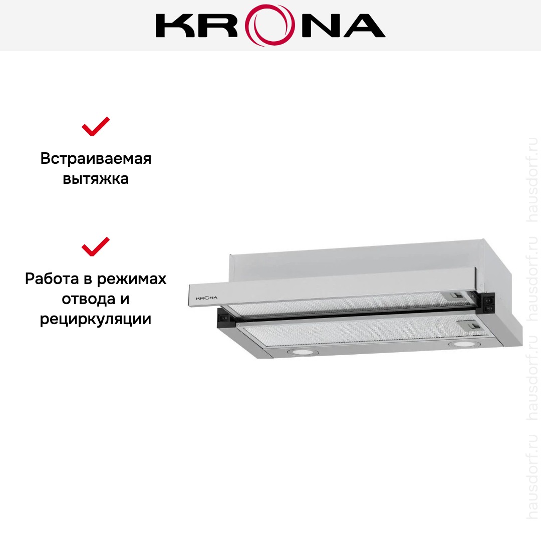Встраиваемая вытяжка — выбор тех, кто хочет максимально задекорировать технику, или владельцев маленькой кухни. Тип встраивания: в шкаф. Обратите внимание на цветовые сочетания модели KRONA KAMILLA MV 6002 INOX, чтобы органично вписать ее в свою квартиру. Оттенок корпуса: нержавеющая сталь. Благодаря лампочкам, которые расположены на нем, можно освещать плиту и столешницу рядом, чтобы готовить было еще проще и приятнее. Фишка этой техники — выдвижная панель.