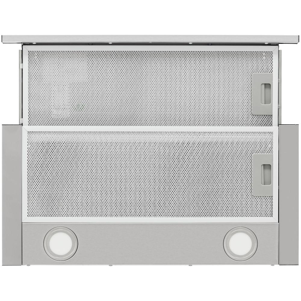 В вытяжках, интегрированных в варочную поверхность и работающих в режиме рециркуляции, панель выдвигается при включении зоны нагрева автоматически. В закрытом же состоянии видны только сенсорные управляющие элементы, которые находятся вровень с варочной поверхностью.