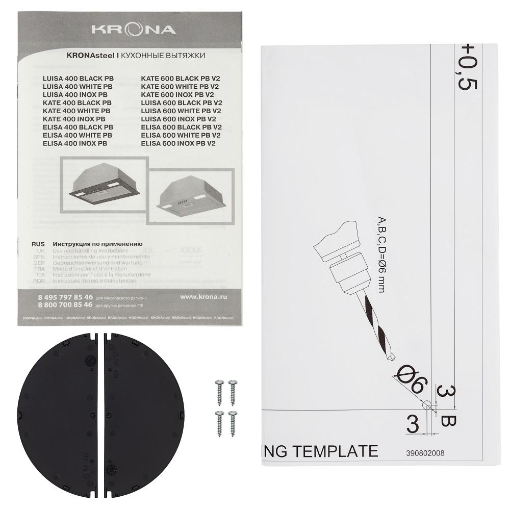 Встраиваемая вытяжка — выбор тех, кто хочет максимально задекорировать технику, или владельцев маленькой кухни. Тип встраивания: в шкаф. Обратите внимание на цветовые сочетания модели KRONA KATE 600 WHITE PB V2, чтобы органично вписать ее в свою квартиру. Оттенок корпуса: белый. Благодаря лампочкам, которые расположены на нем, можно освещать плиту и столешницу рядом, чтобы готовить было еще проще и приятнее.