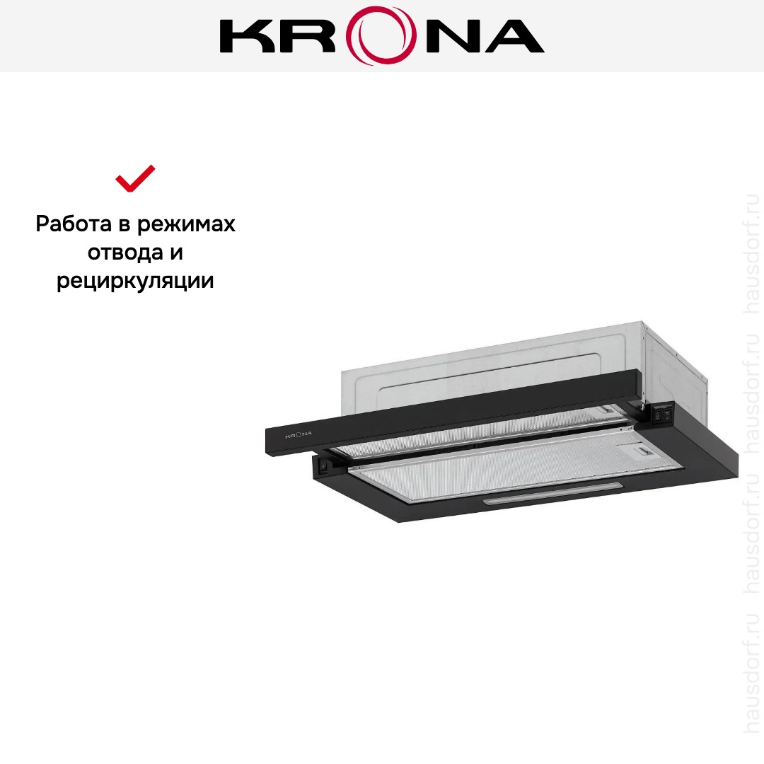 Встраиваемая вытяжка — выбор тех, кто хочет максимально задекорировать технику, или владельцев маленькой кухни. Тип встраивания: в шкаф. Обратите внимание на цветовые сочетания модели KRONA KERRY 600 BLACK PB V2, чтобы органично вписать ее в свою квартиру. Оттенок корпуса: черный. Благодаря лампочкам, которые расположены на нем, можно освещать плиту и столешницу рядом, чтобы готовить было еще проще и приятнее. Фишка этой техники — выдвижная панель.