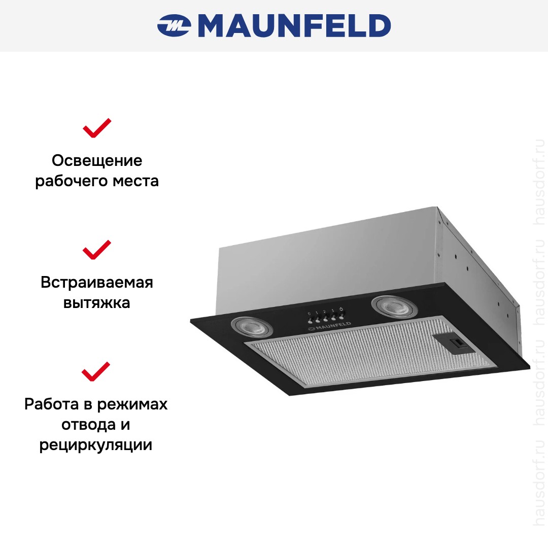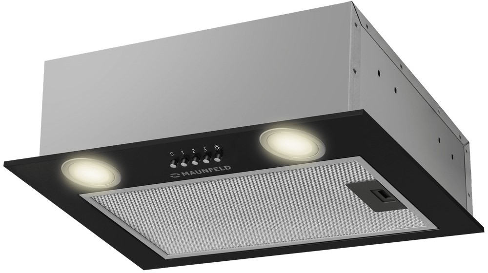 Встраиваемая вытяжка — выбор тех, кто хочет максимально задекорировать технику, или владельцев маленькой кухни. Тип встраивания: в шкаф. Обратите внимание на цветовые сочетания модели Maunfeld Bay 45 Push Black, чтобы органично вписать ее в свою квартиру. Оттенок корпуса: черный. Благодаря лампочкам, которые расположены на нем, можно освещать плиту и столешницу рядом, чтобы готовить было еще проще и приятнее.