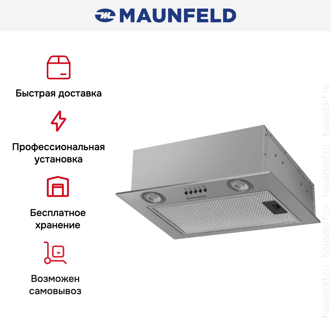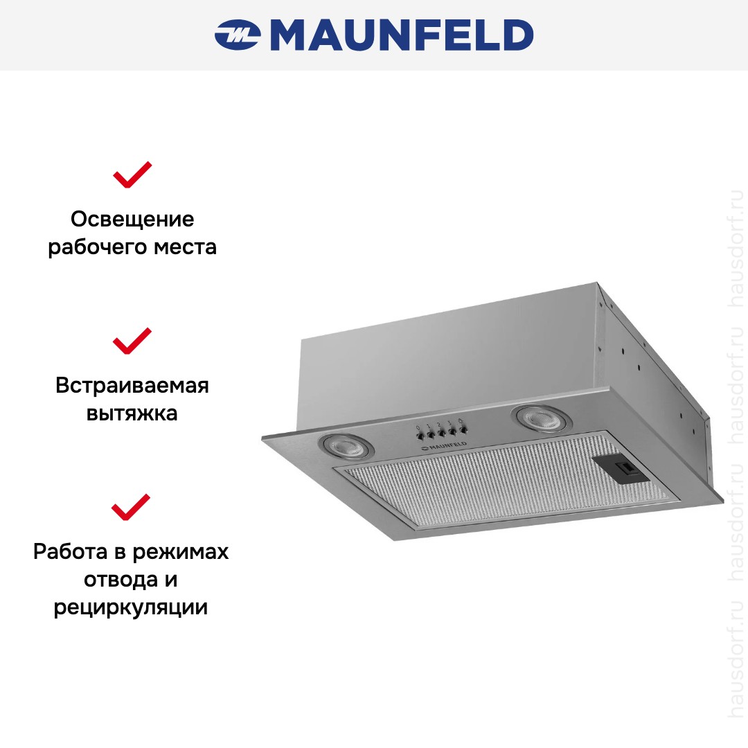 Встраиваемая вытяжка — выбор тех, кто хочет максимально задекорировать технику, или владельцев маленькой кухни. Тип встраивания: в шкаф. Обратите внимание на цветовые сочетания модели Maunfeld Bay 45 Push Inox, чтобы органично вписать ее в свою квартиру. Оттенок корпуса: нержавеющая сталь. Благодаря лампочкам, которые расположены на нем, можно освещать плиту и столешницу рядом, чтобы готовить было еще проще и приятнее.