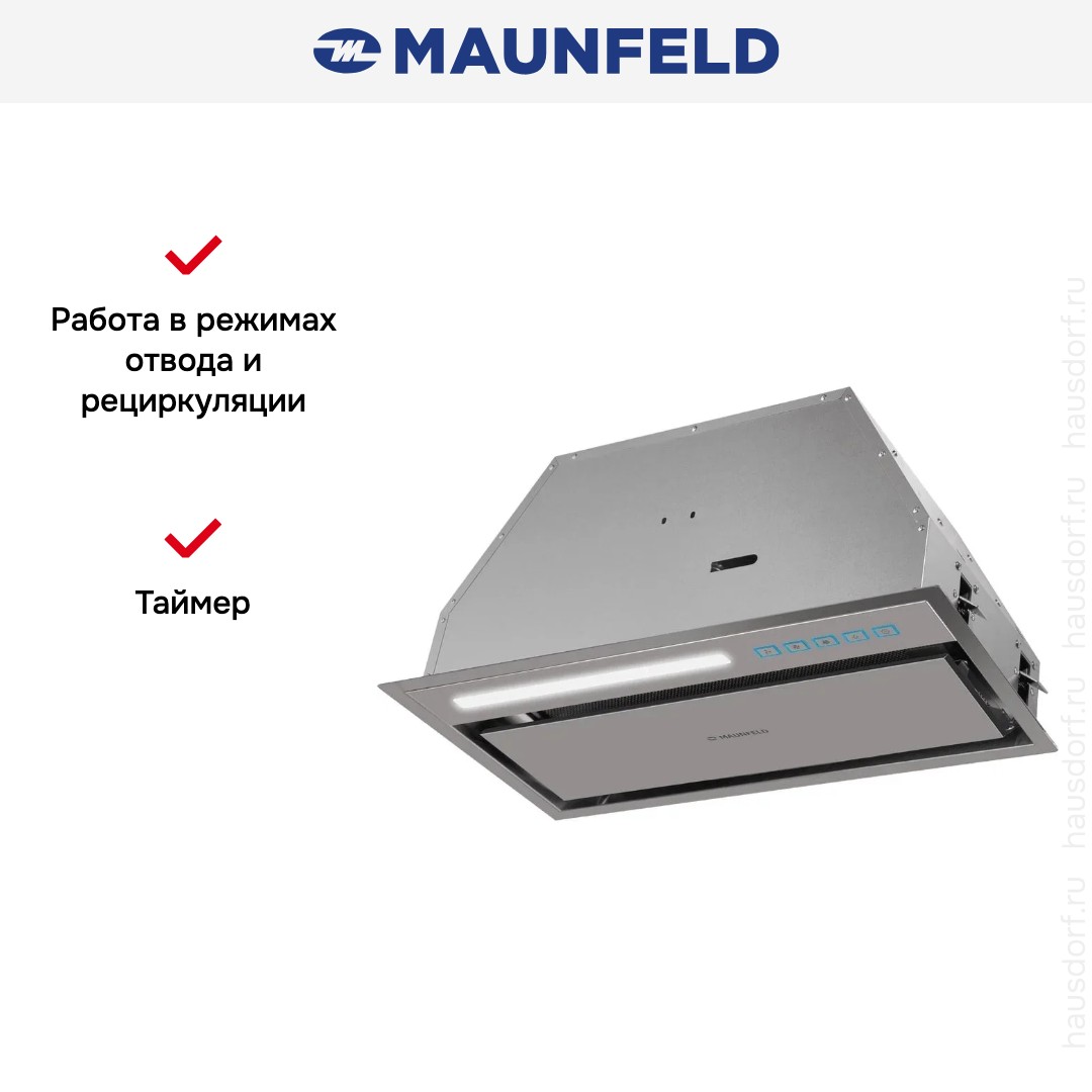 Встраиваемая вытяжка — выбор тех, кто хочет максимально задекорировать технику, или владельцев маленькой кухни. Тип встраивания: в шкаф. Обратите внимание на цветовые сочетания модели Maunfeld Clare 60 Inox, чтобы органично вписать ее в свою квартиру. Оттенок корпуса: нержавеющая сталь. Благодаря лампочкам, которые расположены на нем, можно освещать плиту и столешницу рядом, чтобы готовить было еще проще и приятнее.
