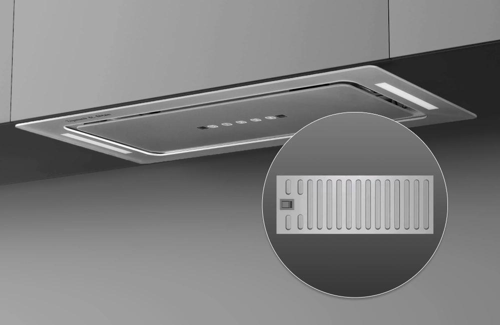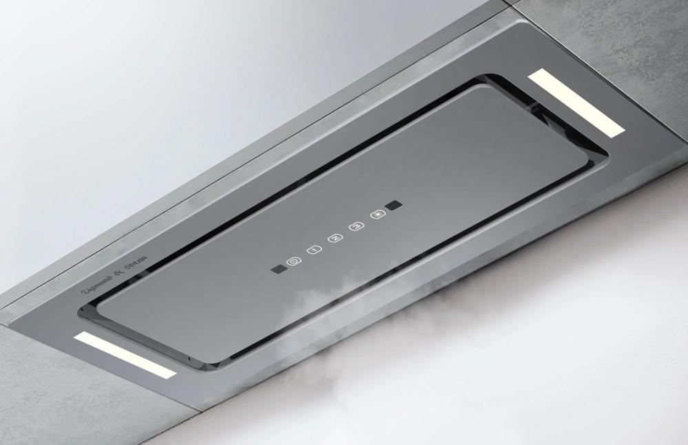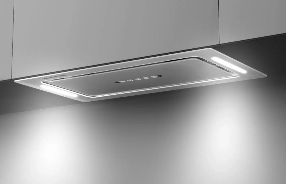 Вытяжка, встраиваемая в потолок, часто устанавливается над кухонным островом в просторной кухне и отличается достаточно высокой мощностью: она может работать как в режиме рециркуляции, так и в режиме отвода, так как воздуховод также скрыт в потолке. Вытяжки могут монтироваться в подвесной потолок либо устанавливаться в специальные многоярусные конструкции из гипсокартона непосредственно во время ремонта кухни. Для управления ими используется пульт ДУ.