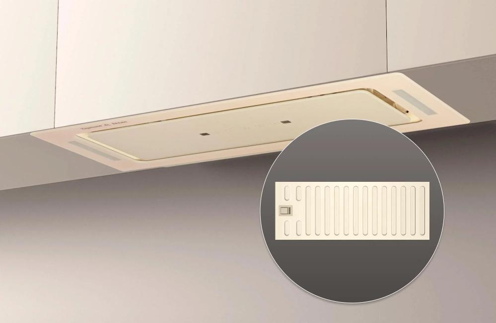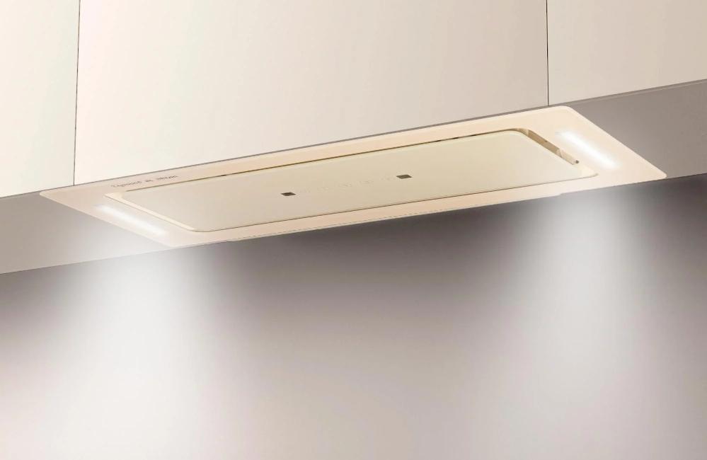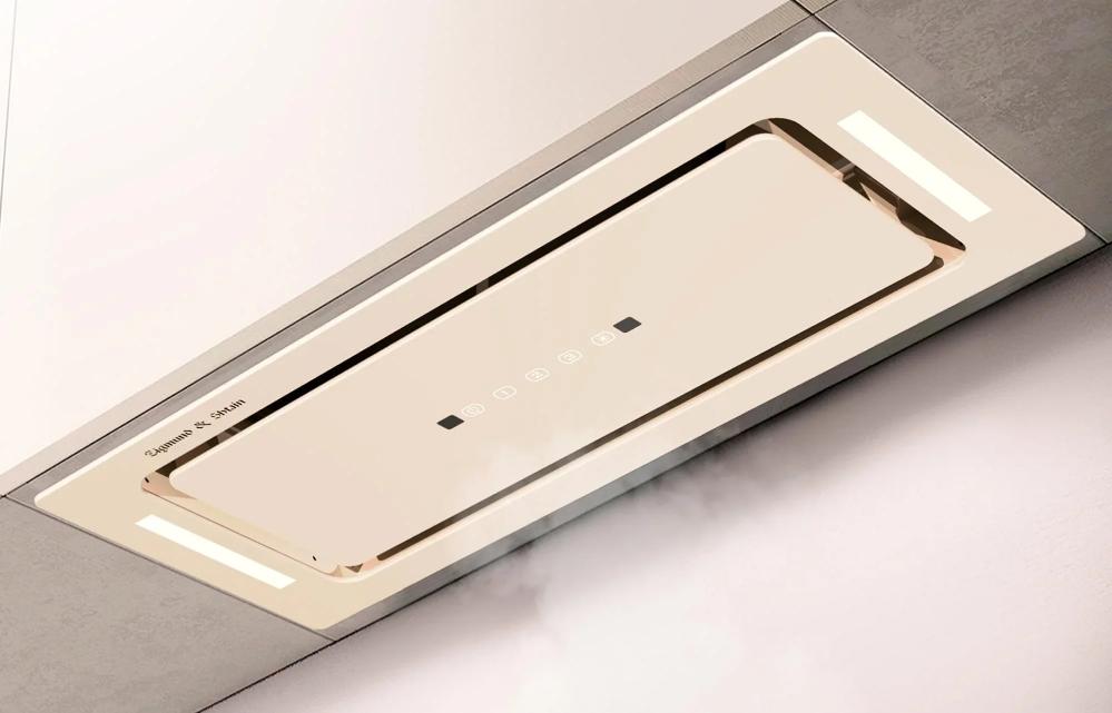Вытяжка, встраиваемая в потолок, часто устанавливается над кухонным островом в просторной кухне и отличается достаточно высокой мощностью: она может работать как в режиме рециркуляции, так и в режиме отвода, так как воздуховод также скрыт в потолке. Вытяжки могут монтироваться в подвесной потолок либо устанавливаться в специальные многоярусные конструкции из гипсокартона непосредственно во время ремонта кухни. Для управления ими используется пульт ДУ.
