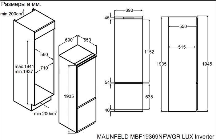 Maunfeld MBF19369NFWGR Lux Inverter - схема с размерами к холодильнику на разных языках на Hausdorf