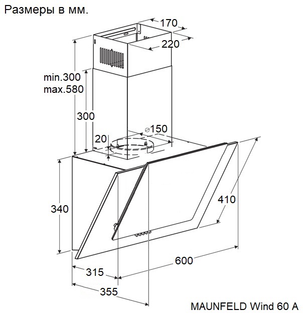 Maunfeld Wind 60 A Black - схема с размерами версия 2 к вытяжке на разных языках на Hausdorf