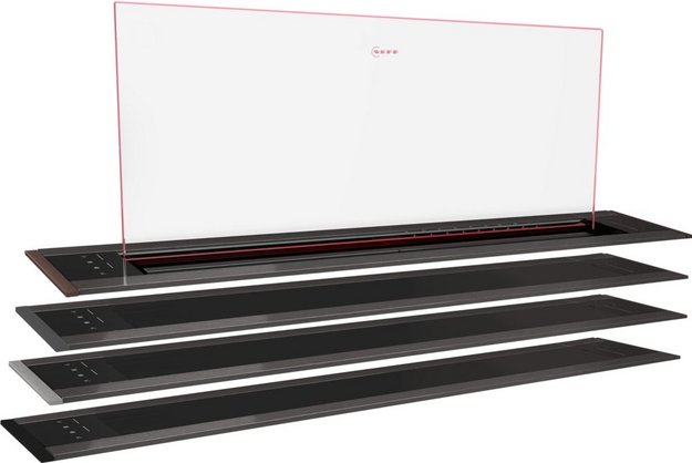 Вытяжки, встраиваемые в столешницу — эффективная инновация, которая подойдет для установки в кухне любой площади. Такие вытяжки размещаются за варочной поверхностью или рядом с ней. В отключенном состоянии всасывающая панель находится под столешницей, но после включения одной или нескольких конфорок она автоматически выдвигается при помощи специального лифтового механизма. Загрязненный воздух улавливается, не успевая распространиться по помещению. Когда вытяжка убрана, на виду остается только сенсорная панель управления. Недостатком подобных моделей является только сравнительно высокая цена.